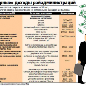 Правда, по его словам, потребовать мзду с жаждущих решить проблему горожан можно только с ведома руководства. «Начальнику идет до 75% от взятки. Рядовой сотрудник «хлебного» отдела каждый месяц заносит шефу от $500 до $5 тыс. Себя тоже не обижают, оставляя от $300 до $500 «левых» денег, — рассказывает Константин, проработавший в РГА более 5 лет. — Зачастую в «хлебных» отделах происходят скандалы из-за того, что сотрудники утаивают от руководства большую часть взяток. Доходит даже до увольнения».