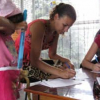 Елена Коркишко, сама беженка из Славянска, с деловитым видом раздает бланки и объясняет правила заполнения документа. Работа спасает ее от мрачных мыслей и стресса.