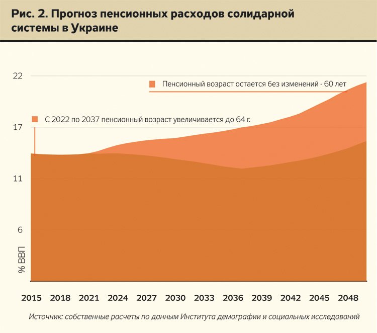 По данным Института демографии и социальных исследований, в Украине соотношение между населением трудоспособного (от 20 до 60 и 57 лет) и пенсионного возраста в 2015 г. составит 2,28 и останется постоянным до 2022-го благодаря повышению с октября 2011 г. общего пенсионного возраста для женщин на шесть месяцев в год, за счет чего уровень пенсионных расходов будет удерживаться на неизменном уровне. Однако из-за демографической ситуации в Украине соотношение между населением трудоспособного и пенсионного возраста будет и в дальнейшем ухудшаться — с 2,28 в 2021 г. до 1,46 в 2050 г. При прочих равных условиях в 2050-м пенсионные расходы возрастут до 21% ВВП, объем финансирования ПФ из государственного бюджета увеличится до 11,5% ВВП, а государственный долг — до 140% ВВП. С таким уровнем пенсионных расходов перспективы национальной экономики не слишком обнадеживающие.