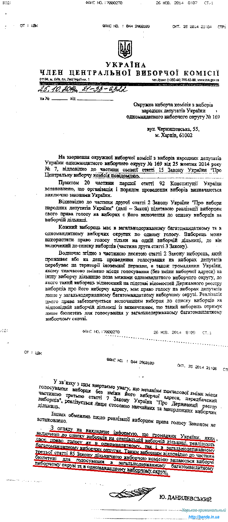 Оставим предположения о том, с чем именно у Ю. Данилевского проблемы – с чтением, адекватным восприятием, совестью или законопослушанием – для особо интересующихся. А члены участковой комиссии вполне резонно ответили Мосежной, что письмо адресовано вообще в другой округ – не 168, а 169. К тому же если им и направлено какое письмо, то оно должно быть не факсовой копией непонятно чего, а оригиналом с чернильной печатью и подписью. И пока этого не будет, говорить не о чем, поскольку за ход выборов отвечает именно участковая комиссия. Для которой факс – не документ, но может оказаться поводом для привлечения к уголовной ответственности, чего никто из комиссии не жаждет.