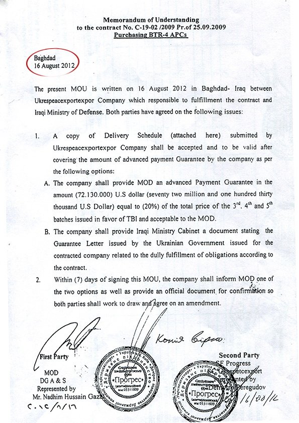 Второе — никакой это не «документ о продолжении контракта», открывающий путь для продолжения поставок техники в рамках «безоблачных» отношений с Ираком. Это опус под названием «меморандум о взаимопонимании». В качестве обязательного условия продолжения сотрудничества с Украиной он требует предоставления украинским спецэкспортером гарантии оплаты в сумме 72 млн. 130 тыс. долл. в банке ТВІ, акцептированном минобороны Ирака. Кроме того, иракская сторона требует от украинской компании «Прогресс» предоставить государственные гарантии от украинского правительства касательно добросовестного исполнения украинским поставщиком обязательств по контракту. А далее в меморандуме вообще замечательная фраза, которая является венцом разоблачения Саламатина и Перегудова: упомянутые требования иракской стороны необходимы для того, чтобы лишь начать (!!!) разработку и согласования дополнений к контракту.