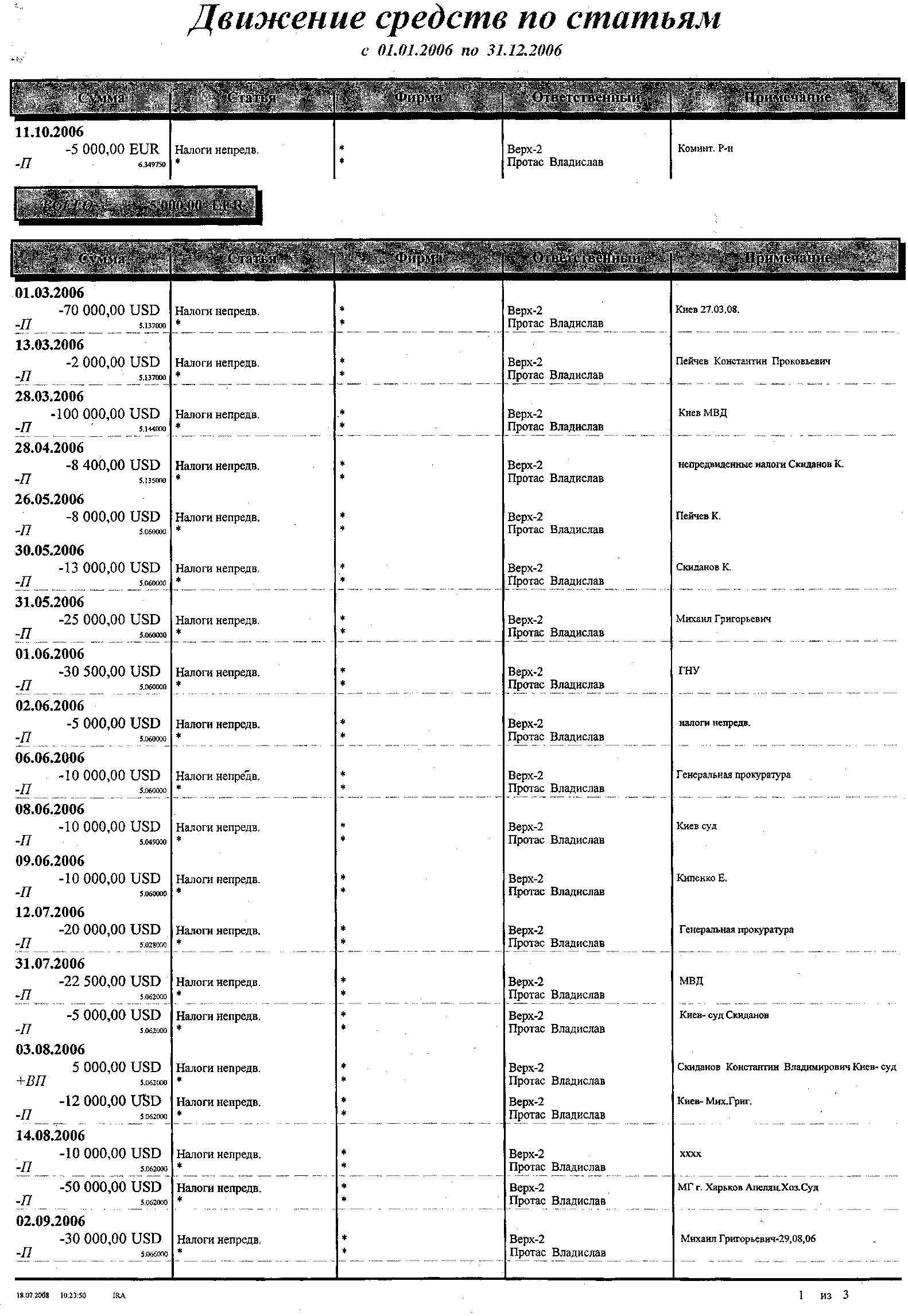 Так, в 2006 году Протасы торжественно трубили о своих победах в судах против горсовета. Правда, суды почему-то проходили не в Харькове. А теперь и настоящая причина становится понятной. Если почитать этот гроссбух – видно, что взятки несли всюду. В МВД, ГНАУ, Генпрокуратуру, суды всех уровней и массы областей. Понятное дело, в районные суды Харькова – по месту, в апелляционный областной Харьковский – спорили они со многими, в Высший хозяйственный… А самым излюбленным способом доказательства своей «правоты» были взятки в суды Львова и Луцка, где они судились с Харьковским горсоветом. И хоть на бумагах нет печатей и подписей, все оказывается просто. Вспоминаем, когда Протасы одержали очередную победу и смотрим в гроссбух. А там видим, почем была победа.