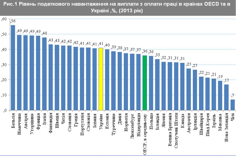По результатам исследований ставки налогообложения затрат на оплату труда установлено, что ставки налогообложения в Украине несколько выше, чем средние показатели развитых стран и не являются самыми высокими, как это традиционно считается. В частности, средневзвешенный уровень налоговой нагрузки, определенный на микроуровне, в Украине в 2013 г. составлял 38,6%, а непрямая ставка налогообложения, определенная на макроуровне, составила 37,3% (отличие среднего уровня налоговой нагрузки в Украине (СНН — 38,6%) и непрямой ставки налогообложения (37,3%) обусловлено тем, что при определении СНН не учитывается налоговая социальная льгота на детей, а также налоговые скидки по налогу на доходы физических лиц, предусмотренные статьей 166 НКУ). Вместе с тем в странах ЕС непрямая ставка налогообложения выплат по оплате труда составляет 36,1%.