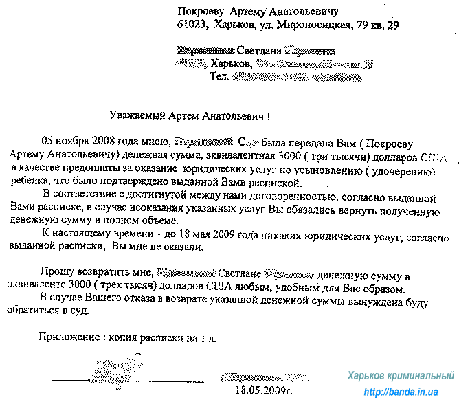 Светлане П. Артем Покроев обещал организовать усыновление ребенка и оформить все необходимые документы. Для этого ему понадобилось 3 тысячи долларов, которые были незамедлительно выданы. И хоть оказание услуг – не делание долгов, результат был тем же. Деньги Артем забрал, усыновление до сих пор не оформлено.