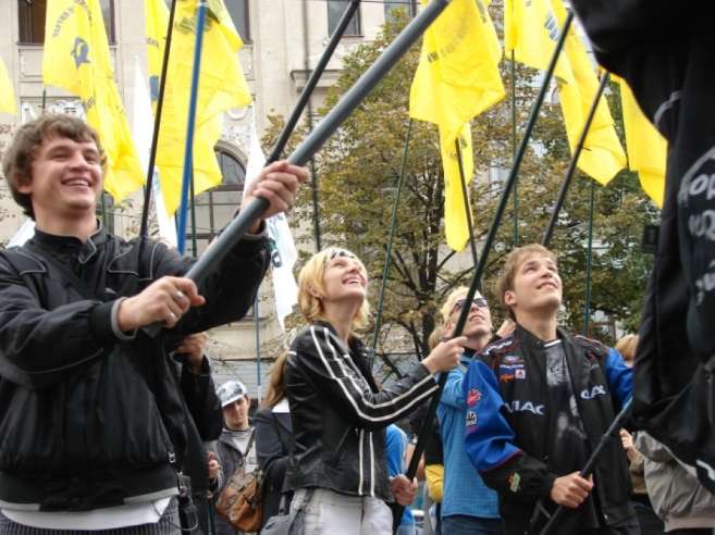 3 апреля регионалы выгнали людей на митинг - все должны были попротестовать против вступления Украины в НАТО. Для начала всех заставили прогуляться от площади до площади. И кого здесь только не было. Впереди - боевое трио: Добкин, Салыгин, Кривцов.